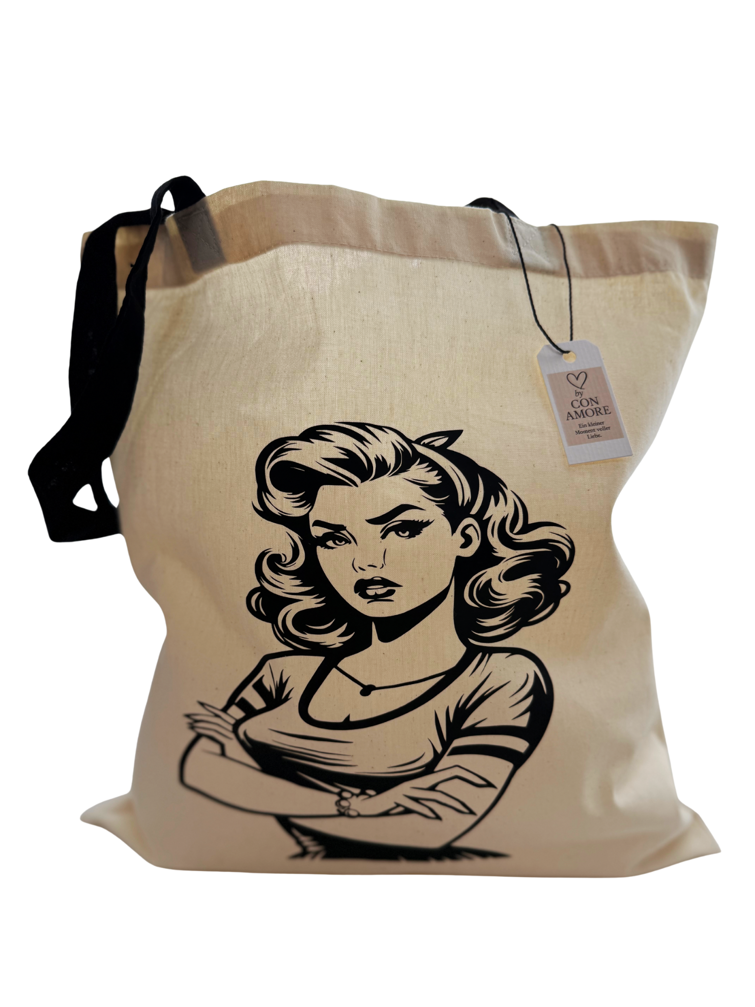 Setze ein Statement – mit dieser coolen Baumwolltasche im Retro-Pop-Art-Stil. Das markante Motiv einer starken Frau macht diese Tasche zu einem echten Hingucker und Ausdruck von Selbstbewusstsein und Stil. Perfekt für Alltag, Shopping oder Freizeit.